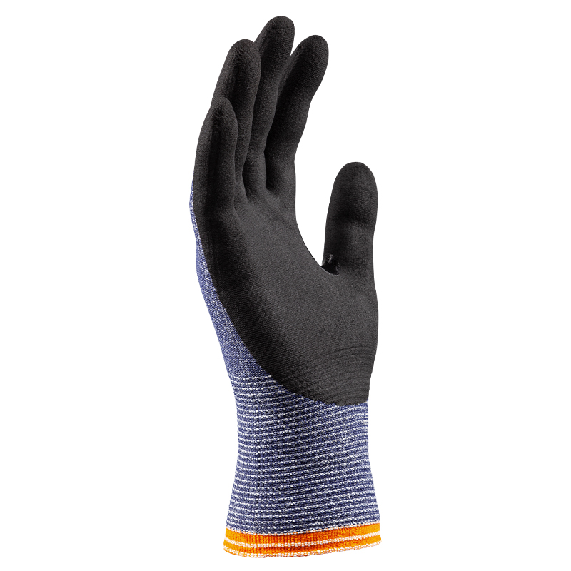 5-Finger-Strick-Handschuh aus HPPE Schnittschutz-Faser mit Nylon und Glasfaser, Innenhand schwarze NFT-Nitrilschaum- Beschichtung mit Nitril-Verstärkung zwischen Zeigefinger und Daumen, Strickbund, nach Öko Tex Standard 100, flexibel, sehr gute Passform, gutes Tastgefühl, hohe Standzeit
