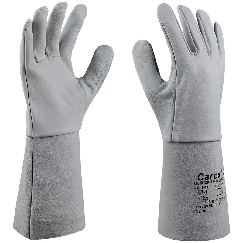 5-Finger-Schweißerschutzhandschuh aus Nappaleder, Flügeldaumen, Pulsschutz, Spaltlederstulpe, Top-Qualität, Lederstärke: ca. 0,8 – 0,9 mm, Gesamtlänge ca. 35 cm, Schutzhandschuhe für Schweißer EN 12477