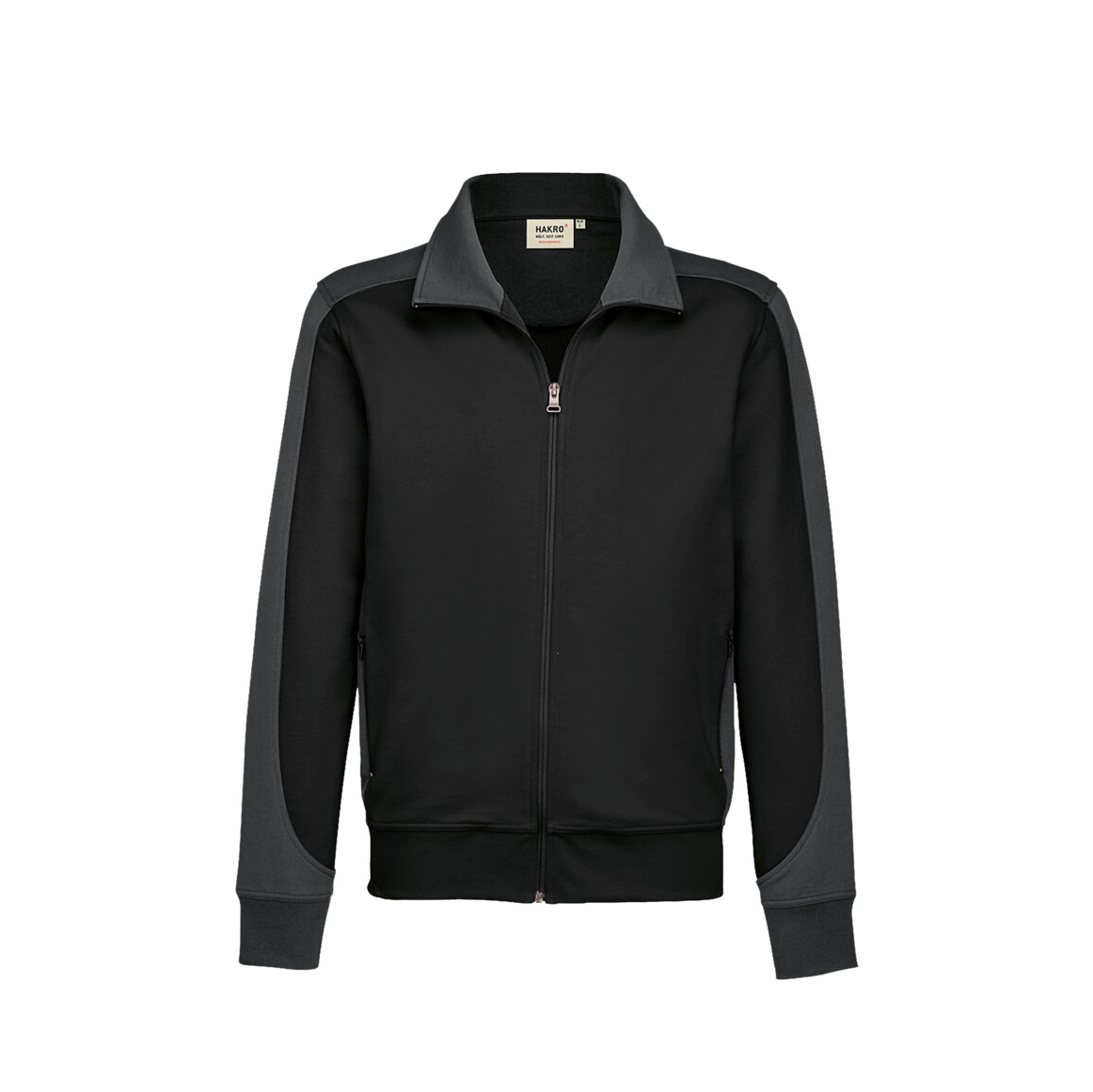 Besonders strapazierfähige Sweatjacke mit Einsätzen in Kontrastfarbe Anthrazit an den Seiten, Ärmeln, Schultern und am Kragen, sowie kontrastfarbigen, gerippten Ärmelbündchen. Leasingkoller zur einfachen Kennzeichnung in der gewerblichen Wäscherei und Aufhängebänder im Saum. Hochwertiger Frontreißverschluss und seitliche Einschubtaschen mit verdeckten Reißverschlüssen. Alle Reißverschlüsse von YKK® Ton in Ton. Mittelschweres Sweatmaterial aus MIKRALINAR®, dem HAKRO Performance-Materialmix aus Baumwolle und Polyester. Innenseite nicht angeraut (French Terry). Formstabile, LYCRA®-verstärkte Bündchen. Lockere Passform: Comfort Fit.