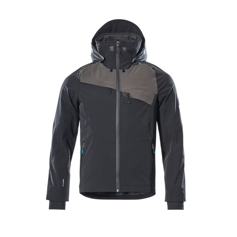 Zweifarbig. Ultimatives Stretchgewebe mit geringem Gewicht und hoher Strapazierfähigkeit. Atmungsaktiv, wind- und wasserdicht. Nähte sind verklebt. Verschluss mit wasserdichtem Reißverschluss und inwendiger Wetterschutzleiste. Kapuze ist abnehmbar, gefüttert und mit verstellbaren Elastikschnüren versehen. Stehkragen mit verstellbaren Elastikschnüren. Innentasche mit Reißverschluss. Brusttaschen mit Reißverschluss. Ergonomisch geschnittene Ärmel ermöglichen hohe Bewegungsfreiheit. Vordertaschen mit Reißverschluss. Rücken ist verlängert. Regulierbarer Gummizug am unteren Saum. Rippenbündchen (verdeckt unter der Wetterschutzleiste) an den Handgelenken. Daumenlöcher am Handgelenk. Reflexeffekte. OEKO-TEX® STANDARD 100. EN 343 3/3