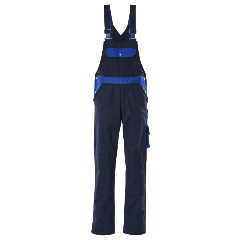 Zweifarbig. Dreifache Kappnähte an den Beinen und im Schritt. Schulterträger aus Stoff, verstellbar und mit kurzem, kräftigem Gummizug sowie Kunststoffschnallen. Latztasche mit Patte und Stifttaschen. Innentasche mit Klettverschluss. Bund ist regulierbar. Vordertaschen. Hosenschlitz mit Reißverschluss. Gesäßtaschen mit Verstärkungen und Patte mit Klettverschluss. Hammerschlaufe, verstellbar. Schenkeltasche mit Patte und Klettverschluss. Zollstocktasche. Knietaschen, höhenregulierbar. OEKO-TEX® STANDARD 100. ProWash® - EN ISO 15797
