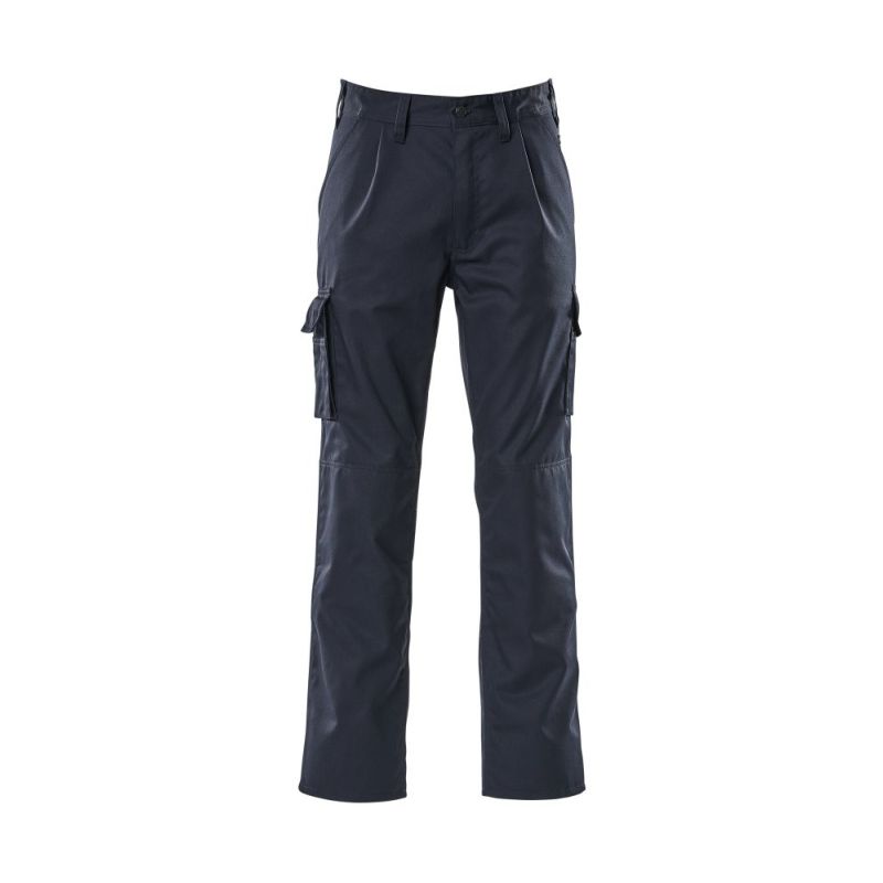 Leichte Meterware. Dreifache Kappnähte an den Beinen und im Schritt. Gürtelschlaufen. Hosenschlitz mit Reißverschluss. Bügelfalten, genäht. Vordertaschen. Gesäßtaschen, paspeliert. Schenkeltaschen, die eine mit Patte und Klettverschluss. Handy-Schenkeltasche mit Patte und verstellbarem Klettverschluss. Zollstocktasche. Stifttaschen. Knietaschen innen. OEKO-TEX® STANDARD 100. ProWash® - EN ISO 15797