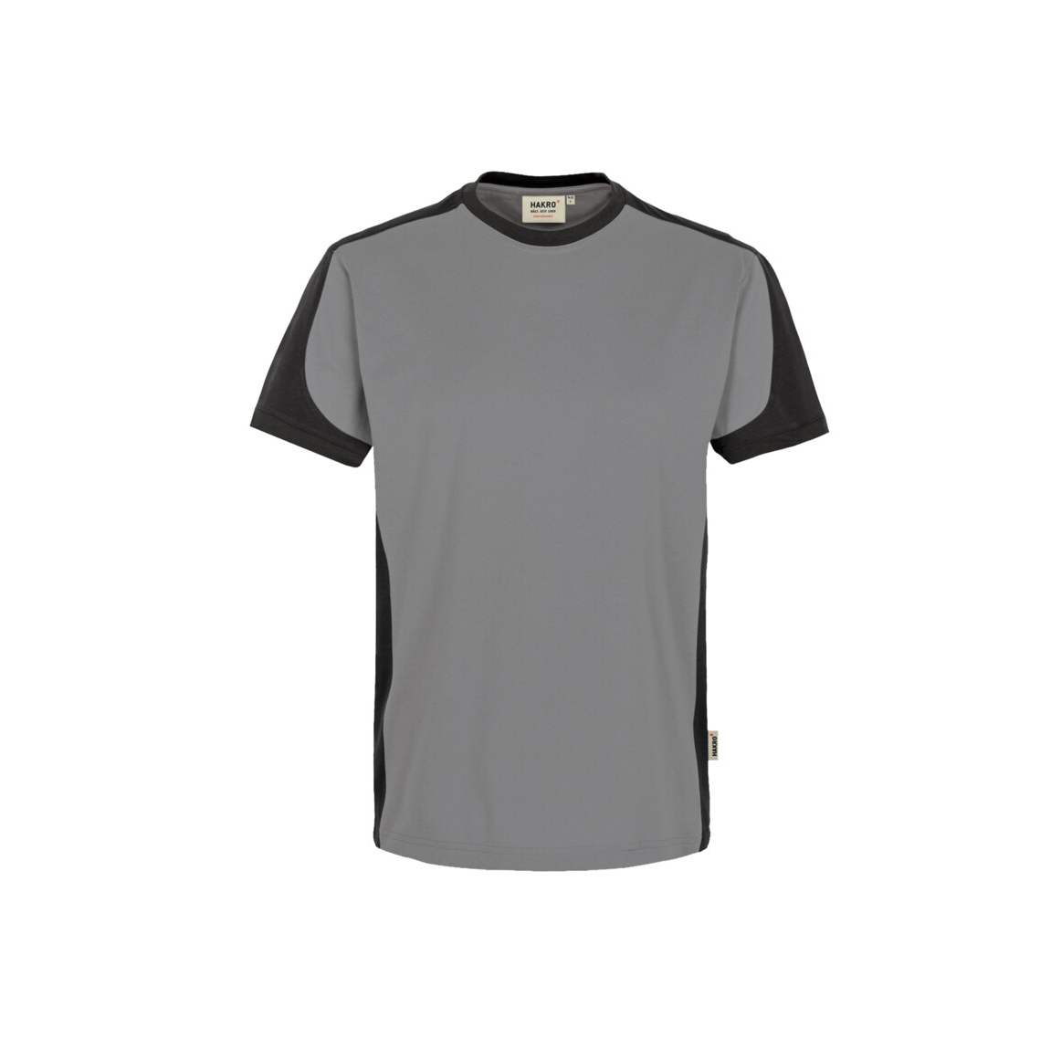 Besonders strapazierfähiges T-Shirt mit Einsätzen in Kontrastfarbe Anthrazit an den Seiten, Schultern und Ärmeln sowie kontrastfarbigen, gerippten Bündchen an Rundhalsausschnitt und Ärmeln. Nackenband, Leasingkoller zur einfachen Kennzeichnung in der gewerblichen Wäscherei und Aufhängebänder im Saum. Mittelschwerer, besonders pflegeleichter und funktioneller Single-Jersey aus MIKRALINAR®, dem HAKRO Performance-Materialmix aus Baumwolle und Polyester. Lockere Passform: Comfort Fit. • Material: MIKRALINAR®, Single-Jersey aus 50 % Baumwolle und 50 % Polyester • Gewicht: 160 g/m² • Eigenschaft: geeignet für Industriewäsche nach DIN EN ISO 15797, pflegeleicht, einlaufvorbehandelt • Passform: Comfort Fit • Zertifikate: Fair Wear, OEKO-TEX® STANDARD 100 • Waschtemperatur: 60 °C • Größen: 2XS-6XL