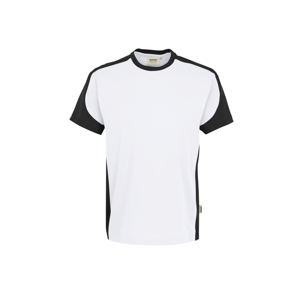 Besonders strapazierfähiges T-Shirt mit Einsätzen in Kontrastfarbe Anthrazit an den Seiten, Schultern und Ärmeln sowie kontrastfarbigen, gerippten Bündchen an Rundhalsausschnitt und Ärmeln. Nackenband, Leasingkoller zur einfachen Kennzeichnung in der gewerblichen Wäscherei und Aufhängebänder im Saum. Mittelschwerer, besonders pflegeleichter und funktioneller Single-Jersey aus MIKRALINAR®, dem HAKRO Performance-Materialmix aus Baumwolle und Polyester. Lockere Passform: Comfort Fit.