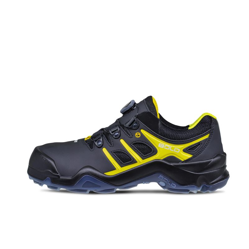 Wasserabweisendes, robustes Anilin Oberleder + Textil. Polyurethan Überkappe. Boa® IP1, Verschlüsse für eine geniale Anpassung an jeden Fuß. Atmungsaktive Distance-Net-Schuhfütterung. Nageldurchtrittschützende T-Laminate. Seitenaufprallschutz. Energy Return Sohlendämpfungssystem. ESD-Ausstattung. Zertifiziert gemäß DGUV 112 - 191. Kappe: Composite Kunststoff Durchtrittschutz: T-Laminate Einlage: Multikomfort-Fußbett Laufsohle: Bold TPU/PU